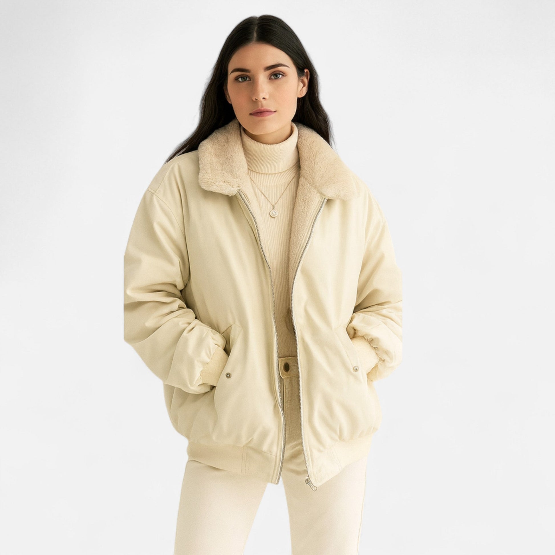 Made from premium insulating fabric, the coat provides lasting warmth while remaining lightweight and comfortable. The oversized cut drapes gracefully, allowing effortless layering without losing its polished structure.